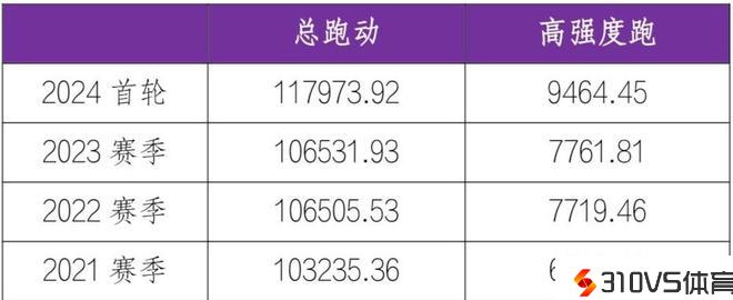 据统计,2024首轮联赛队均总跑动距离为117973.92米,大幅逾越2023赛季的106531.93米。高强度跑距离到达9464.45米,也大幅高于2023赛季的7761.81米。