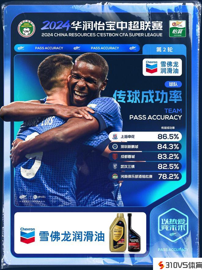 中超第2轮传球成功率:申花86.5%居首,新鹏城第二成都第三