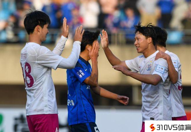 上海申花队球员杨泽翔(右二)与队友庆贺。发
