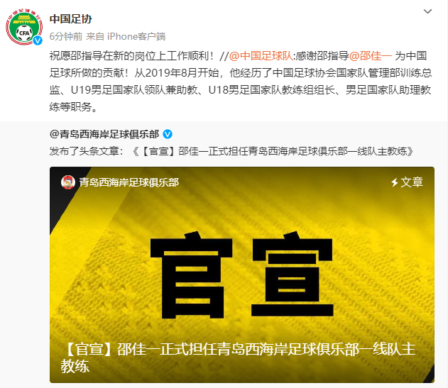 北京时间7月29日讯,青岛西海岸今日官方宣布邵佳一担任球队主教练。官宣后第一时间,中国足协和中国国家队发文对邵佳一表示祝福。