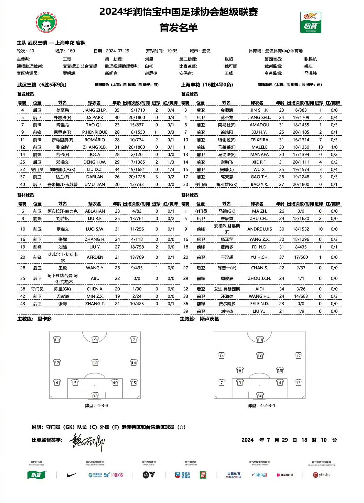 武汉三镇首发阵容: 32-刘殿座; 4-姜至鹏; 25-邓涵文; 5-朴志洙; 40-吾米提江; 14-若卡; 12-张晓彬; 37-门德斯; 11-罗马里奥; 9-恩里克; 7-陶强龙;