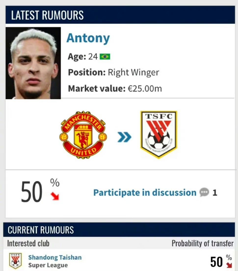 北京时间7月31日讯,近日一条关于曼联球员安东尼正在与山东泰山商讨转会事宜的转会市场图文信息在网上流传。对此,德转朱艺在社媒发文表示,转会市场网编造虚假信息违反版快规则的。