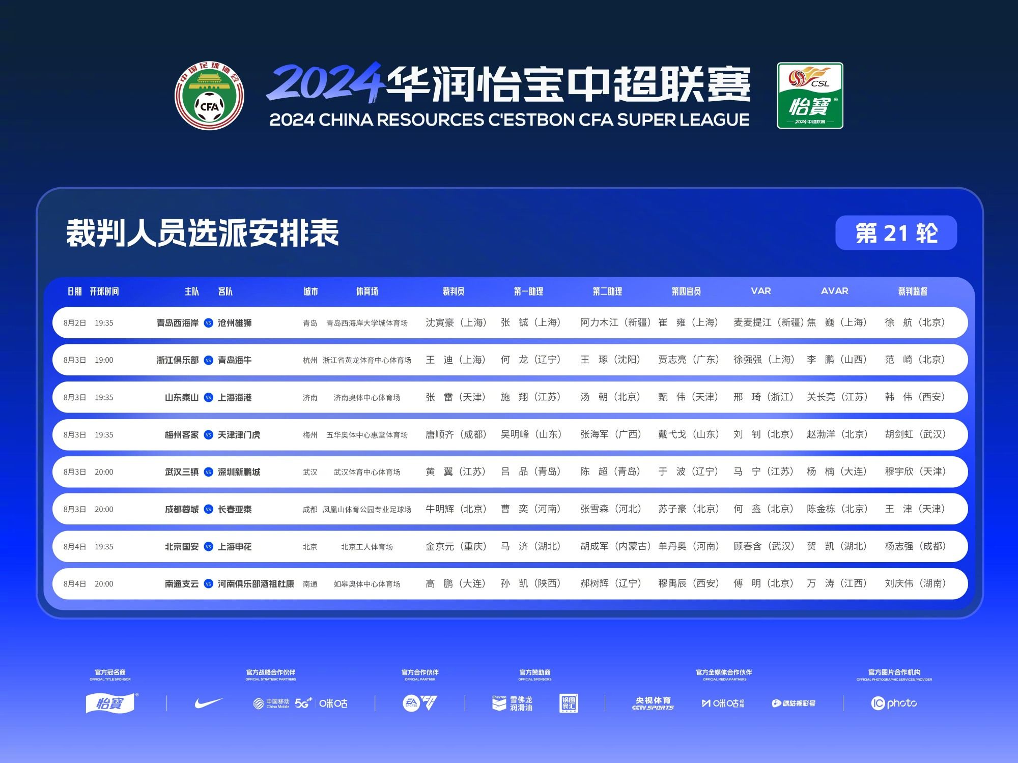 北京时间8月2日讯,中超第21轮裁判选派结果公布。