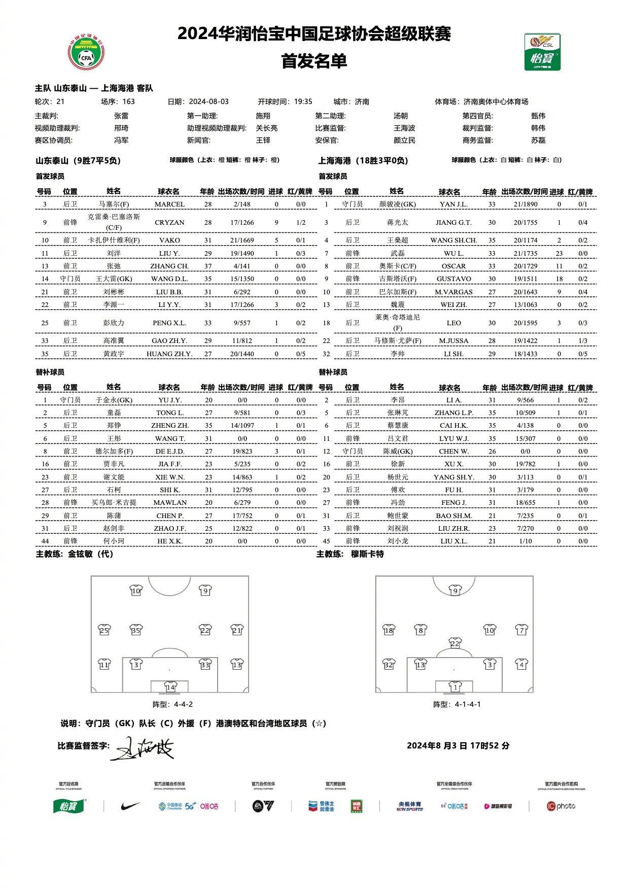 北京时间8月3日晚19点35分,中超联赛第21轮,山东泰山主场对阵上海海港。两队首发已经出炉。
