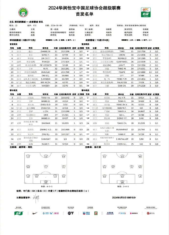 北京时间8月9日,中超联赛第22轮,深圳新鹏城迎战成都蓉城。赛前,两队大名单出炉: