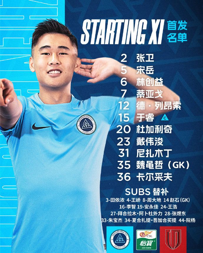 深圳新鹏城首发阵容: 35-魏黾哲; 20-杜加利奇; 15-于睿; 31-尼扎木丁; 5-宋岳; 2-张卫; 6-林创益; 36-卡尔采夫; 23-戴伟浚; 12-列昂索; 7-安德拉德