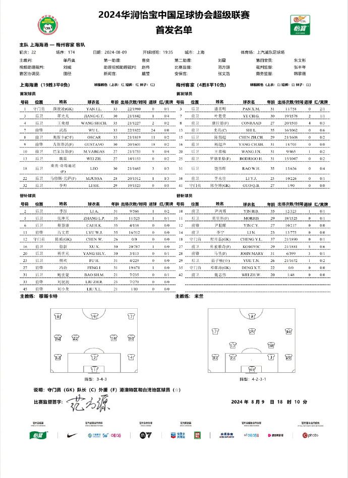 北京时间8月9日,中超联赛第22轮,上海海港迎战梅州客家。赛前,两队大名单出炉: