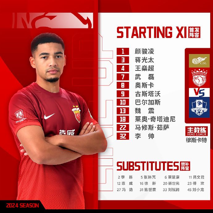 上海海港首发阵容: 1-颜骏凌; 3-蒋光太; 4-王燊超; 32-李帅; 13-魏震; 8-奥斯卡; 18-奇塔迪尼; 10-巴尔加斯; 22-茹萨; 7-武磊; 9-古斯塔沃