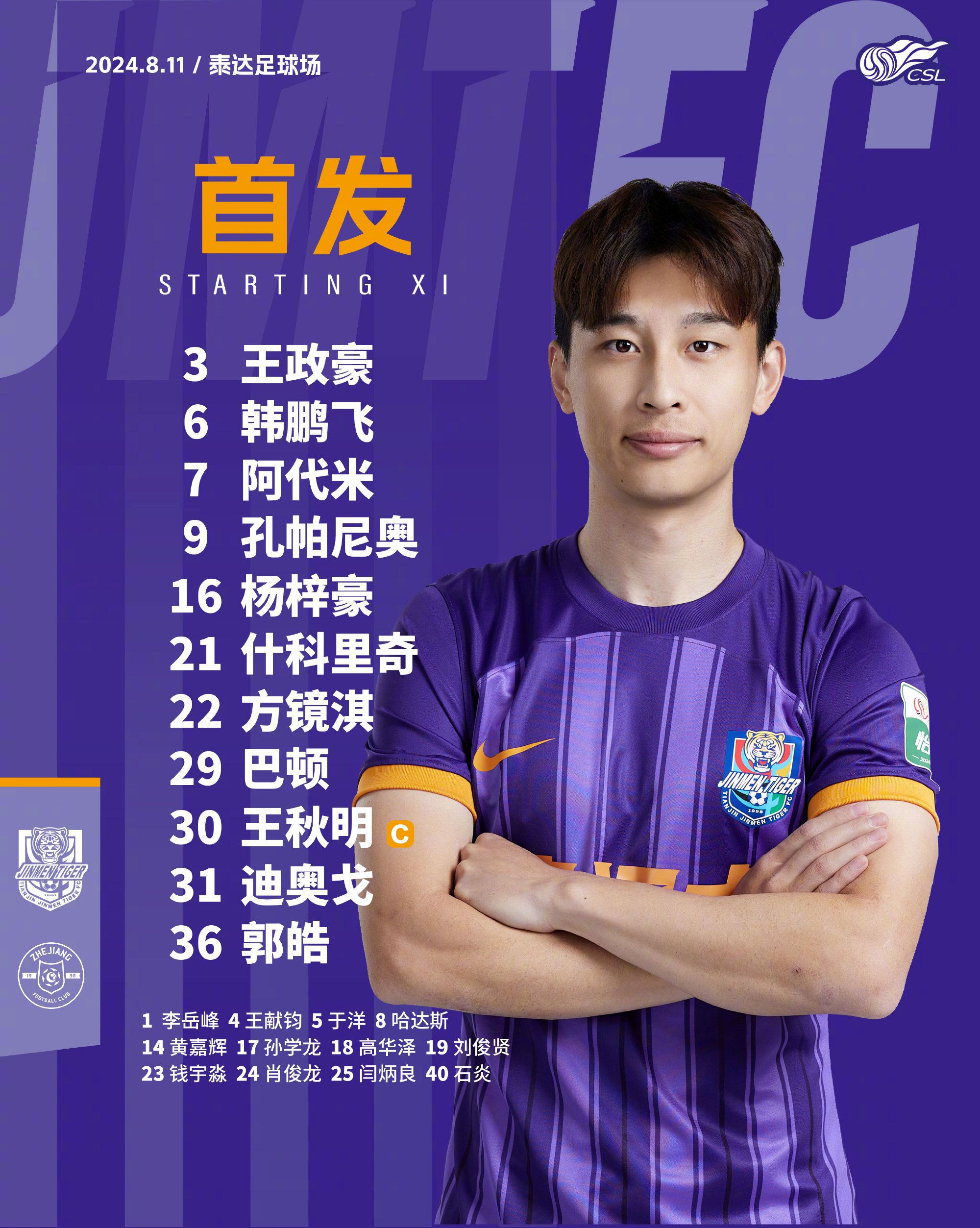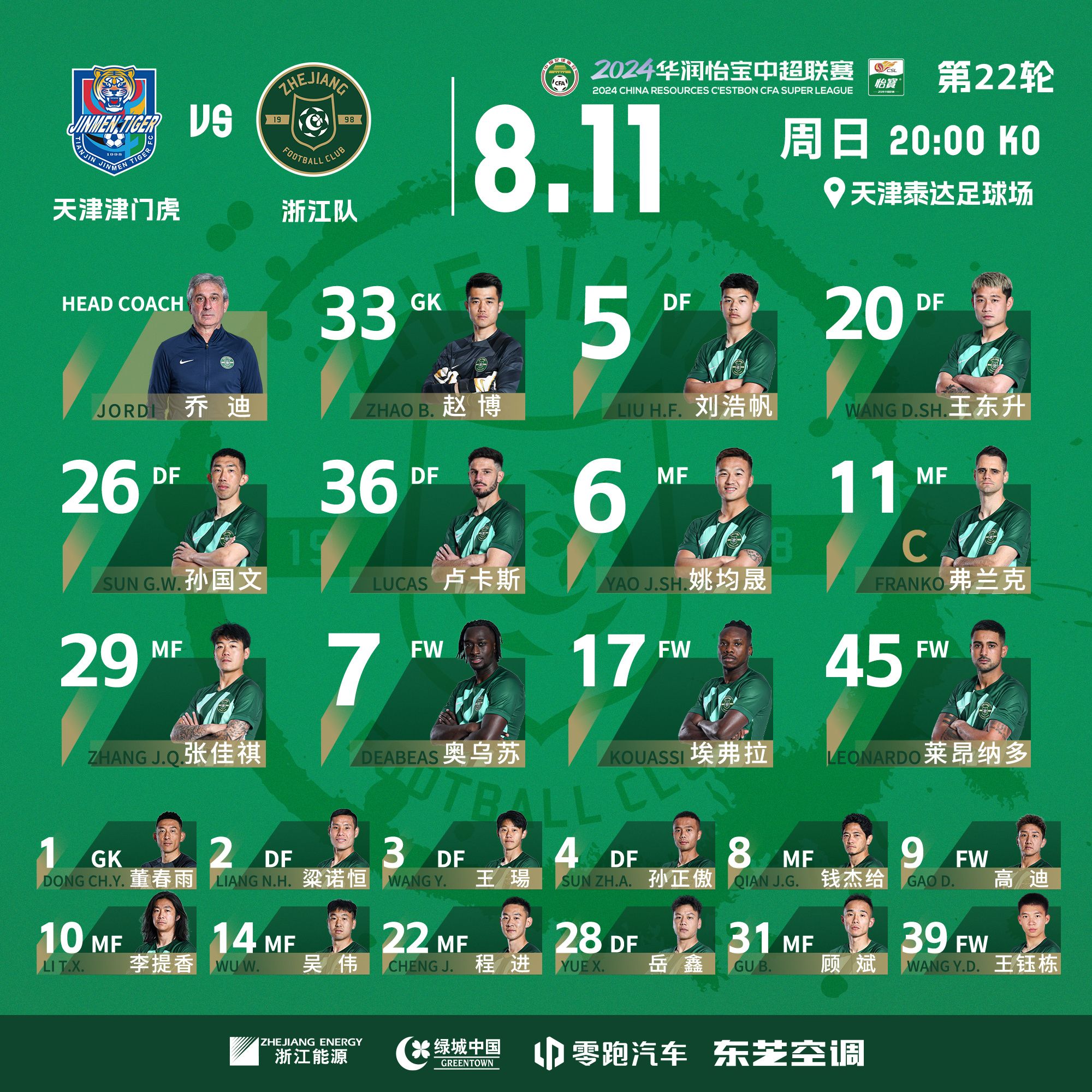 北京时间8月11日晚20:00,中超联赛第22轮,天津津门虎主场对阵浙江,赛前双方首发公布。