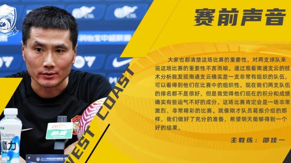邵佳一谈到本场比赛时表示:“大家也都清楚这场比赛的重要性,对两支球队来说这场比赛的重要性不言而喻。通过观看南通支云的技术分析我发现南通支云确实是一支非常有组织的队伍,可以看得到他们在比赛中的组织性。