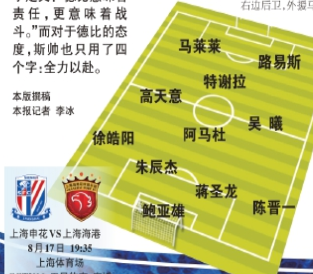 8月17日晚,中超第23轮将展开一场焦点大战,上海申花主场迎战上海海港。赛前,《东方体育日报》预测申花将排出4132的首发阵容。