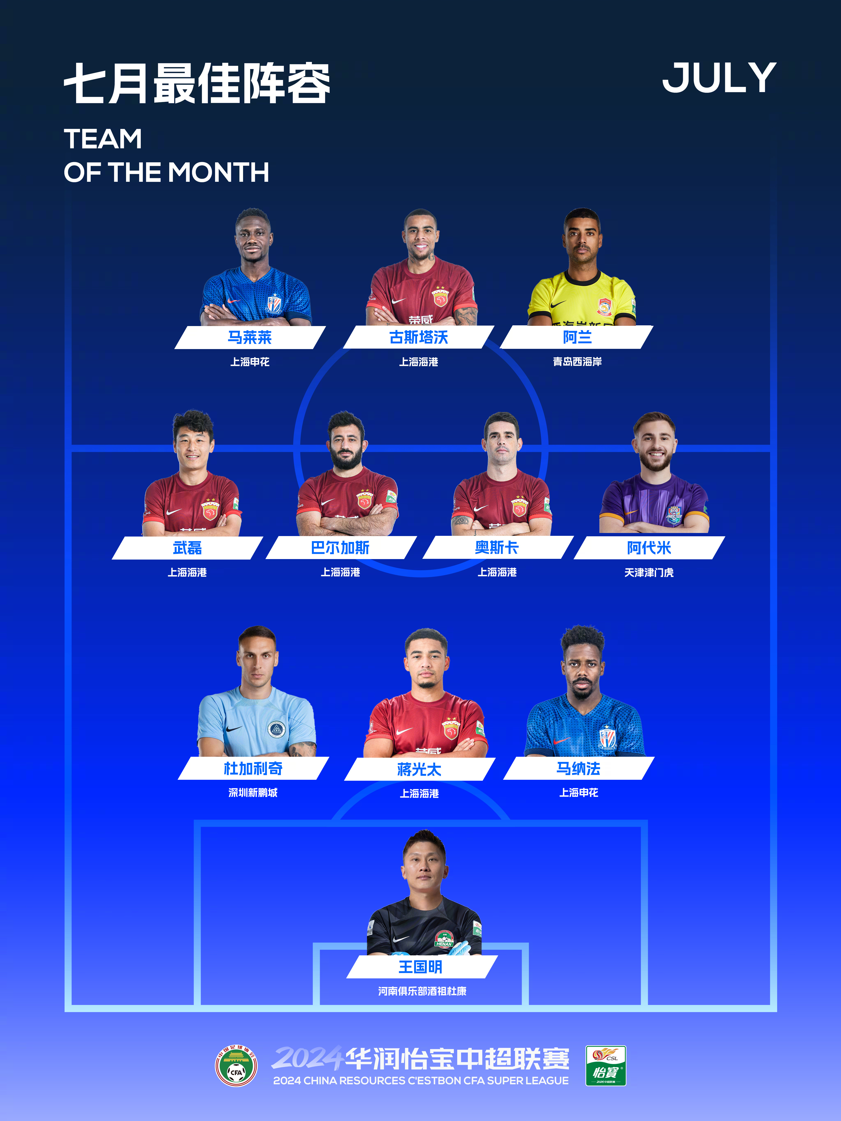 🥇中超联赛官方7月最佳阵容:武磊领衔上海海港5人入选
