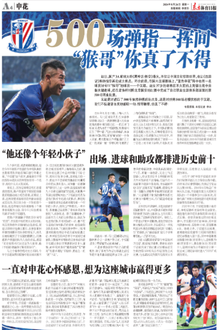 此外,报道还写道,2比1战胜国安晋级今年足协杯四强后,根据统计数据,替补出场的于汉超完成了自己职业足球运动员生涯的第500场俱乐部层面的正式比赛,他也就此成为国内现役球员当中第五位、历史第12人完成这一成就的球员。