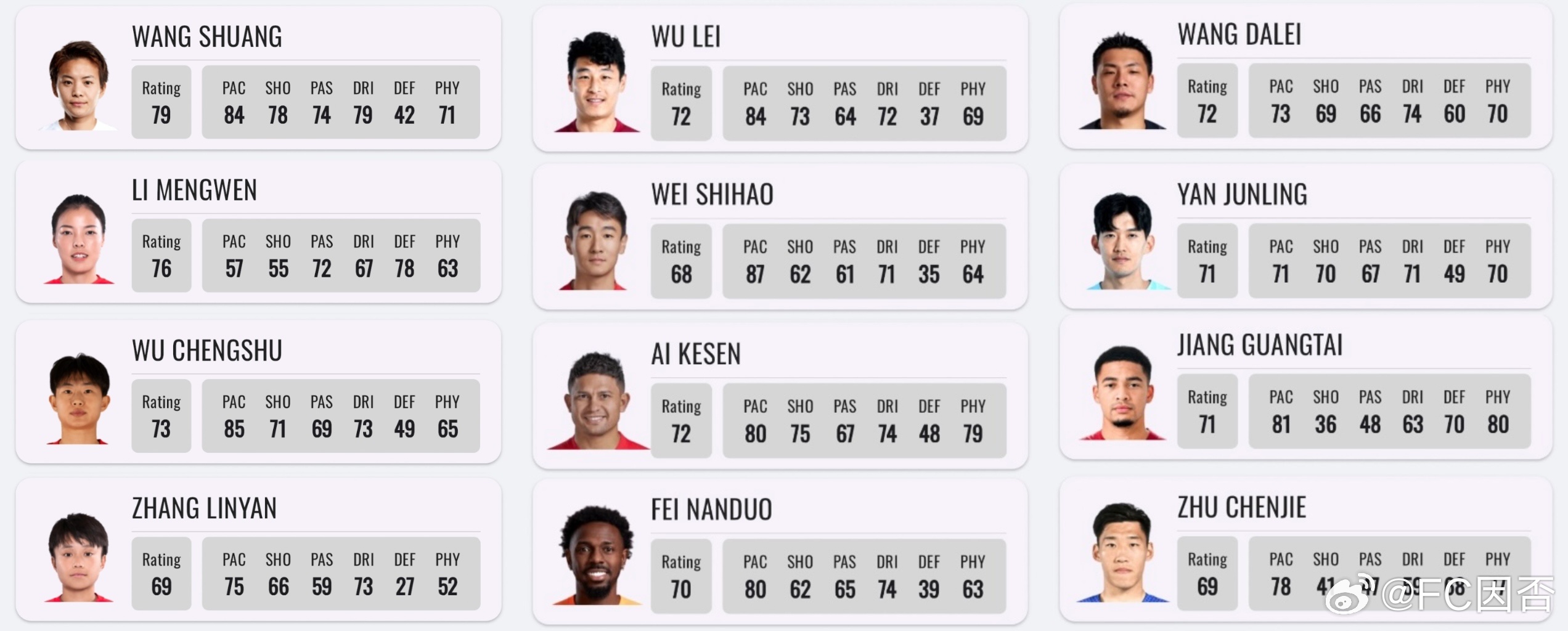 北京时间8月27日讯 日前由博主@FC因否爆料的在EA游戏公司的新一代游戏FC25中,部分中国球员的数据。男足方面武磊、王大雷、埃克森以72的能力值居首,女足方面王霜为所有球员中能力值最高——79。