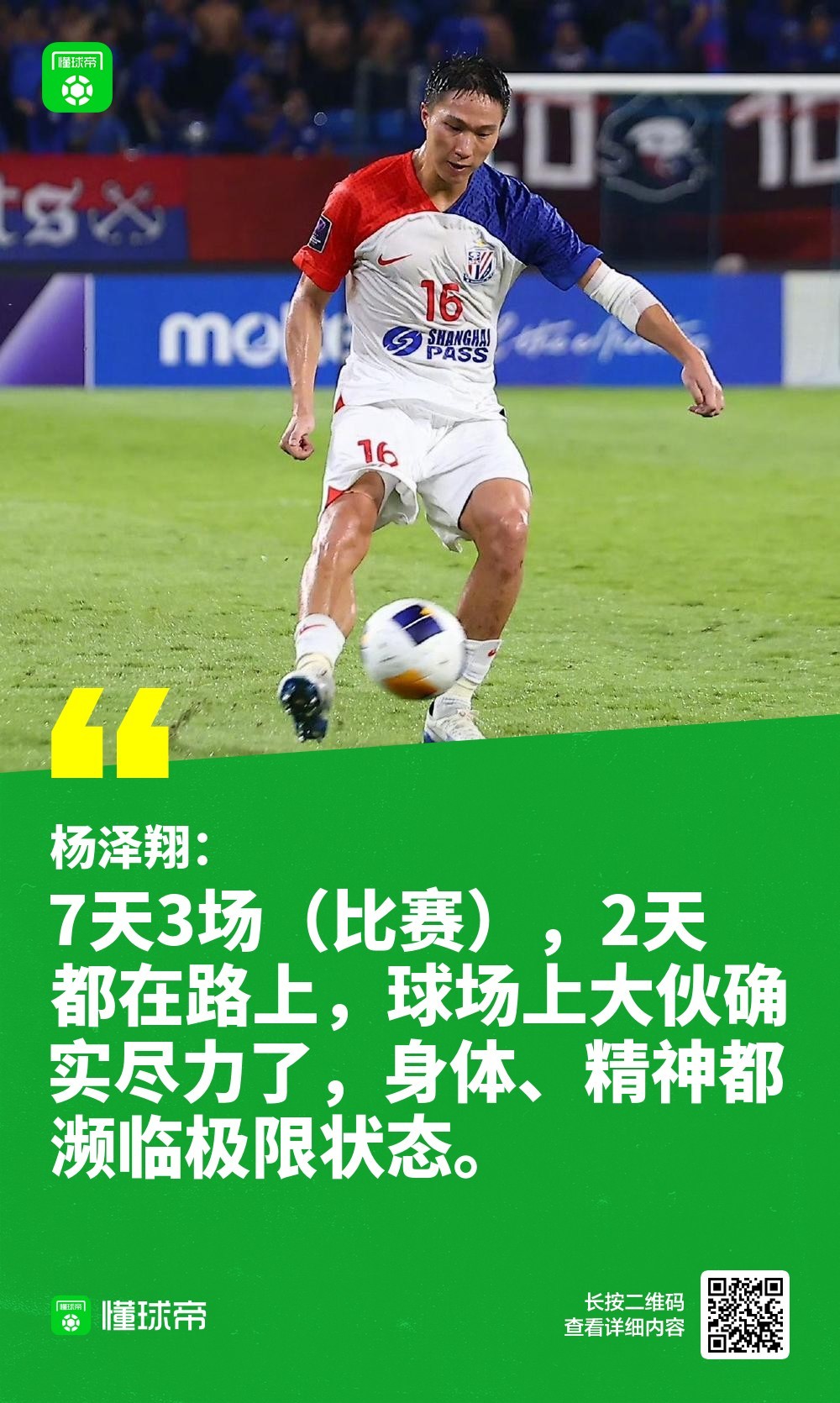 亚冠精英联赛第2轮,上海申花客场0-3不敌马来西亚柔佛新山。此役遭遇失利后,申花队边后卫杨泽翔在微博里表示:“7天3场(比赛),2天都在路上,球场上大伙确实尽力了,身体、精神都濒临极限状态。”