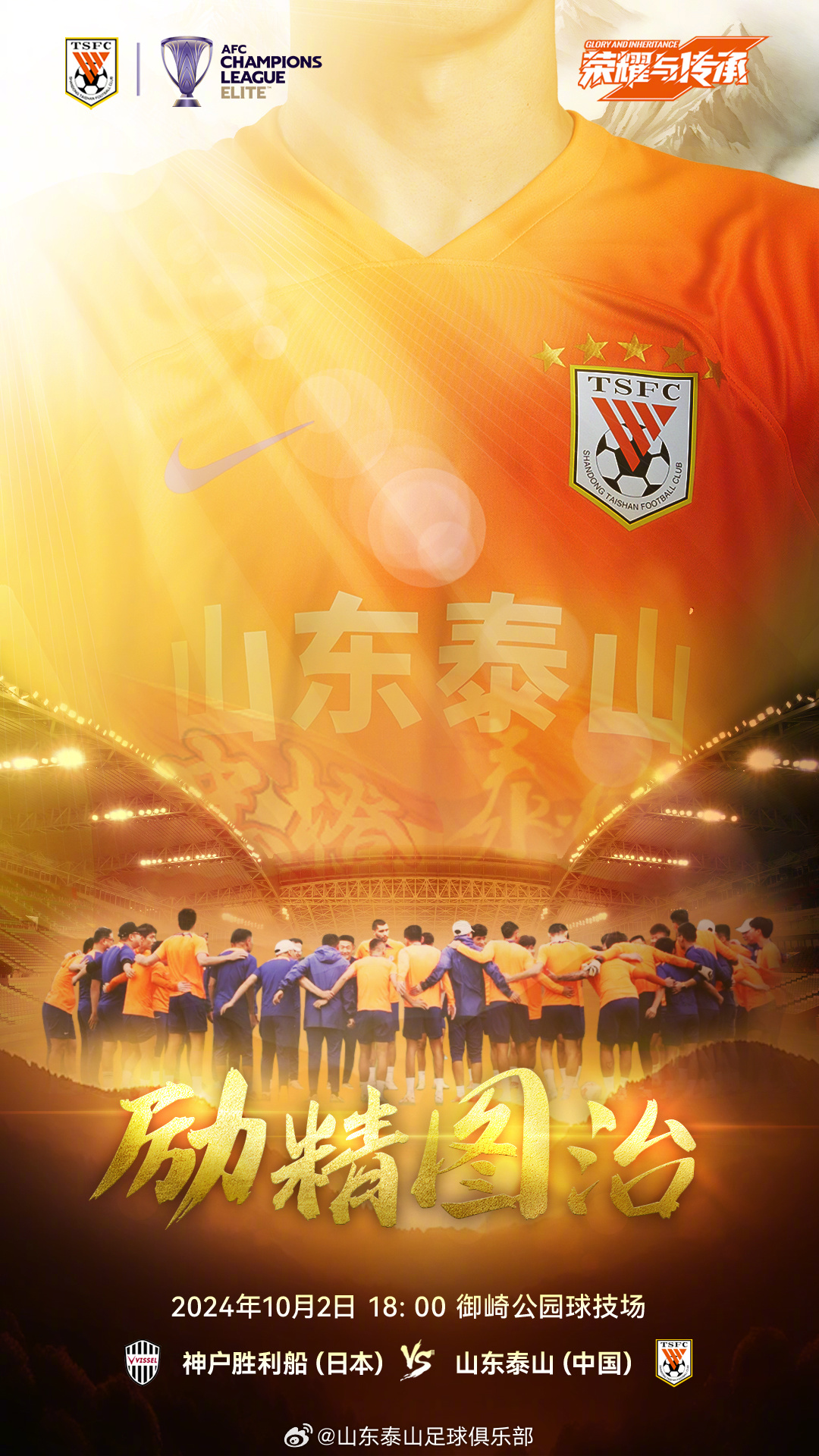亚冠精英联赛第二轮 🆚神户胜利船VS山东泰山 ⏰2024.10.2(周三)18:00 🏟御崎公园球技场 📺爱奇艺、咪咕视频
