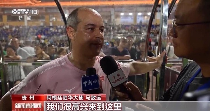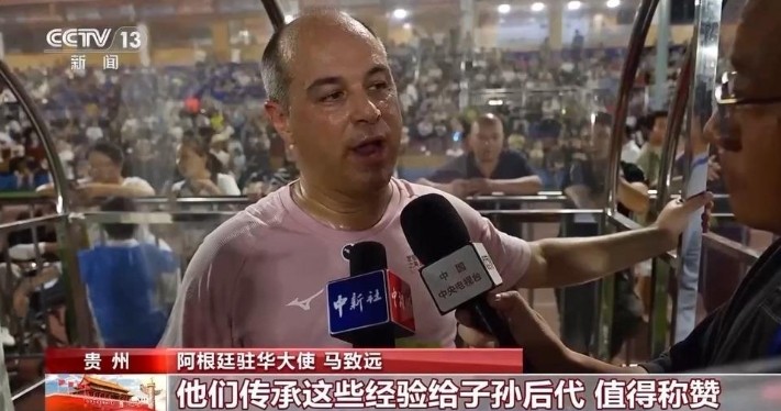 阿根廷驻华大使马致远:“我们受中国文化和旅游部邀请,来到这迷人的‘村超’,我们很高兴来到这里,这里聚集了对体育有着热情的上万名观众,我们与当地球队进行友谊赛非常棒,能够促进我们的交流。”