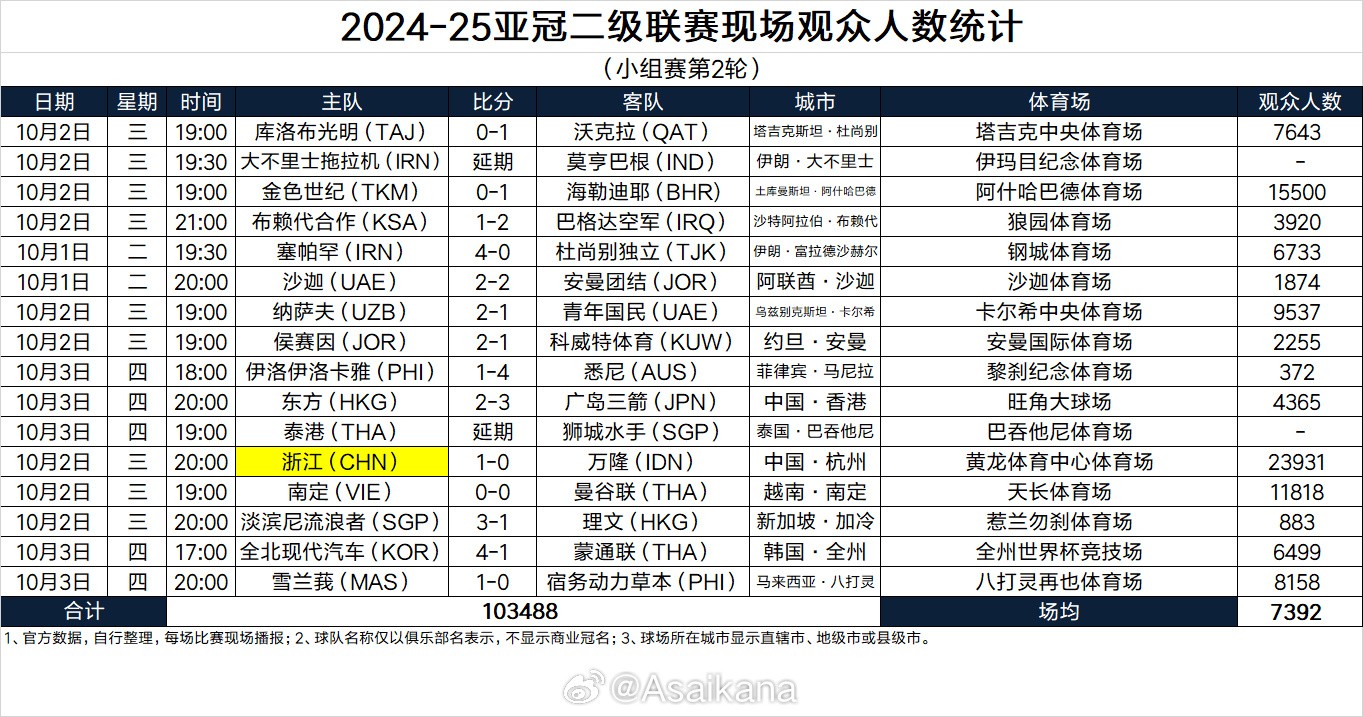 亚冠二级联赛第2轮观众人数统计:浙江队主场23931人最高
