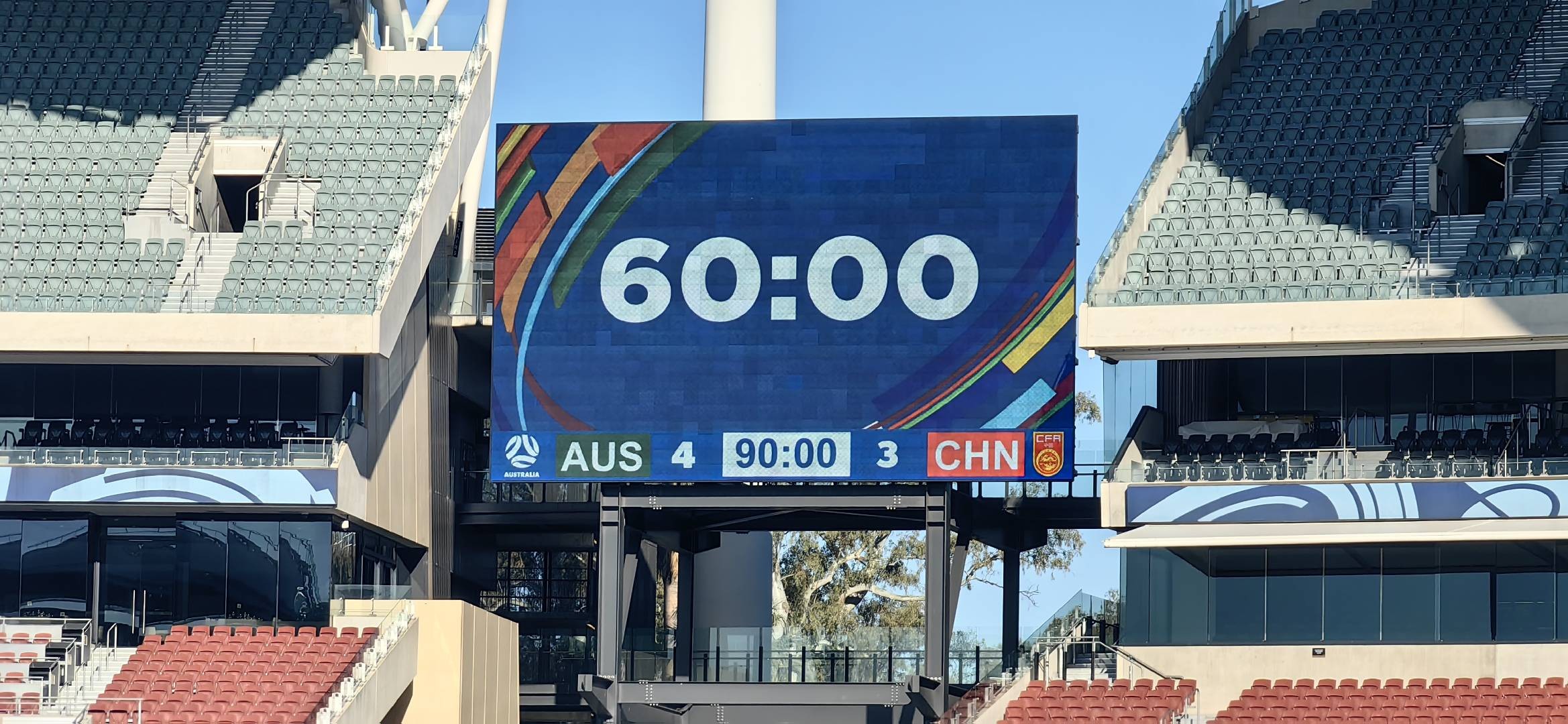 北京时间10月9日下午,澳大利亚阿德莱德椭圆形体育场正在进行主场的彩排预演,据懂球帝记者@雷杰深 现场消息,球场内的大屏幕上显示澳大利亚4-3中国队。