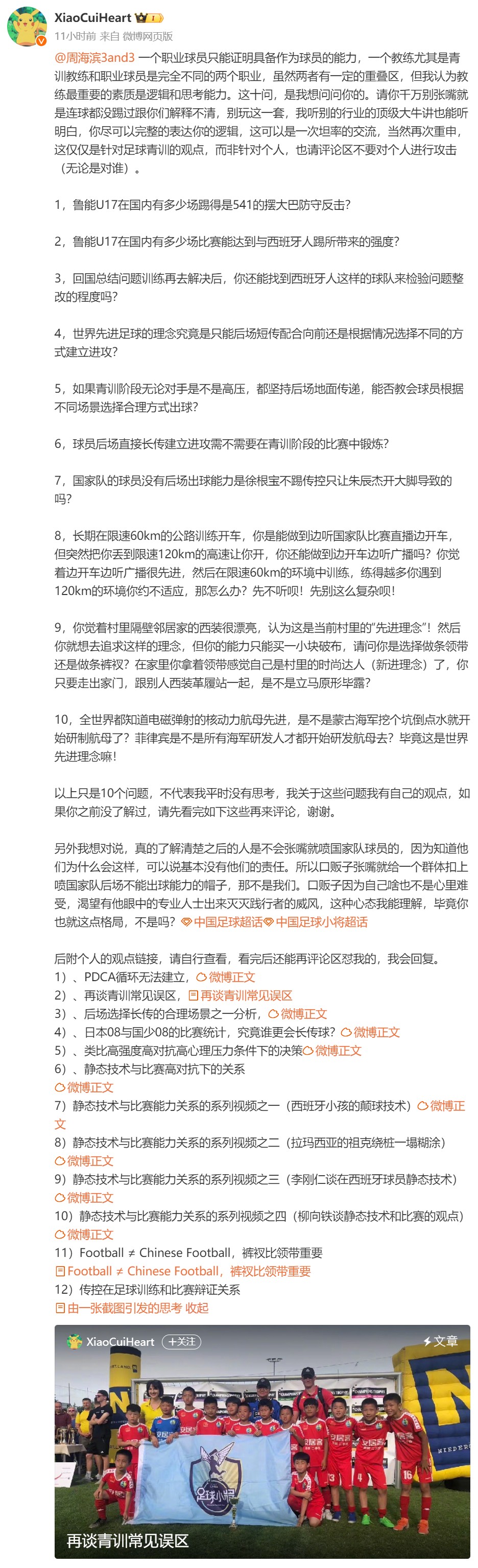 周海滨回复道:“谢谢你这么认真的发出的问题,我不会每个问题去向你解释什么,但我用我的方式告诉你,为什么我这么做,因为我们是职业梯队,我要做的事情就是为俱乐部为国家队培养精英球员,可能我们的球员现在的能力未来出不来五大联赛的,但这是我的本职工作,我必须要尽可能去培养他们。”