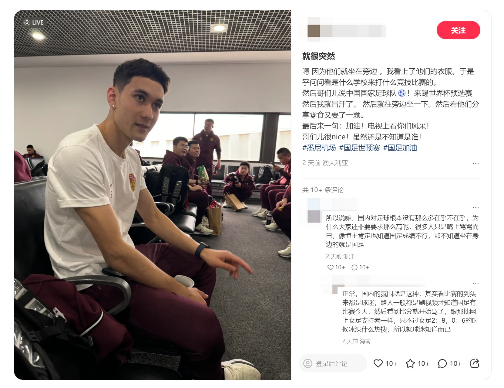 国内平台小红书上一名网友发布了一条帖子,该网友表示在悉尼机场遇到了国足,但错将国足认成了校队。