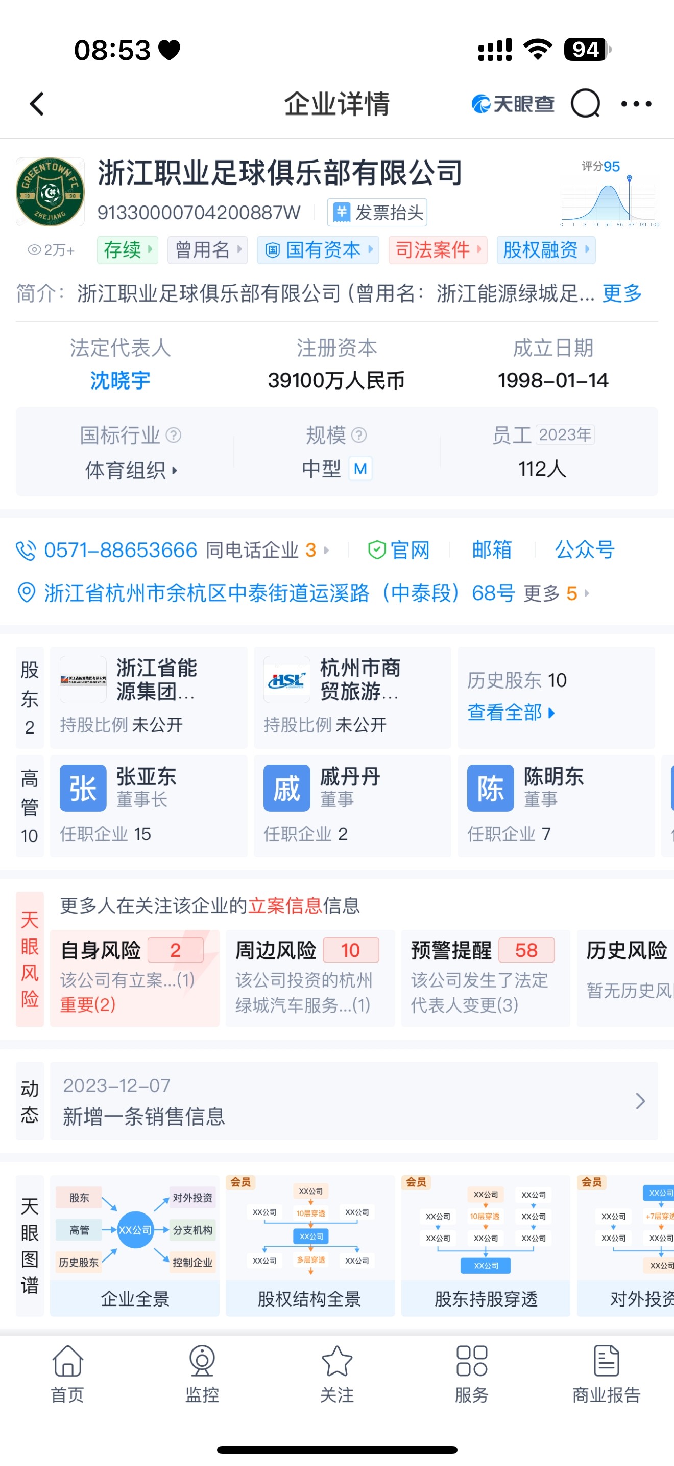 据天眼查信息,杭商旅和浙能各自持股比例未公开。而根据此前媒体报道,杭商旅将持股60%,成为俱乐部大股东。