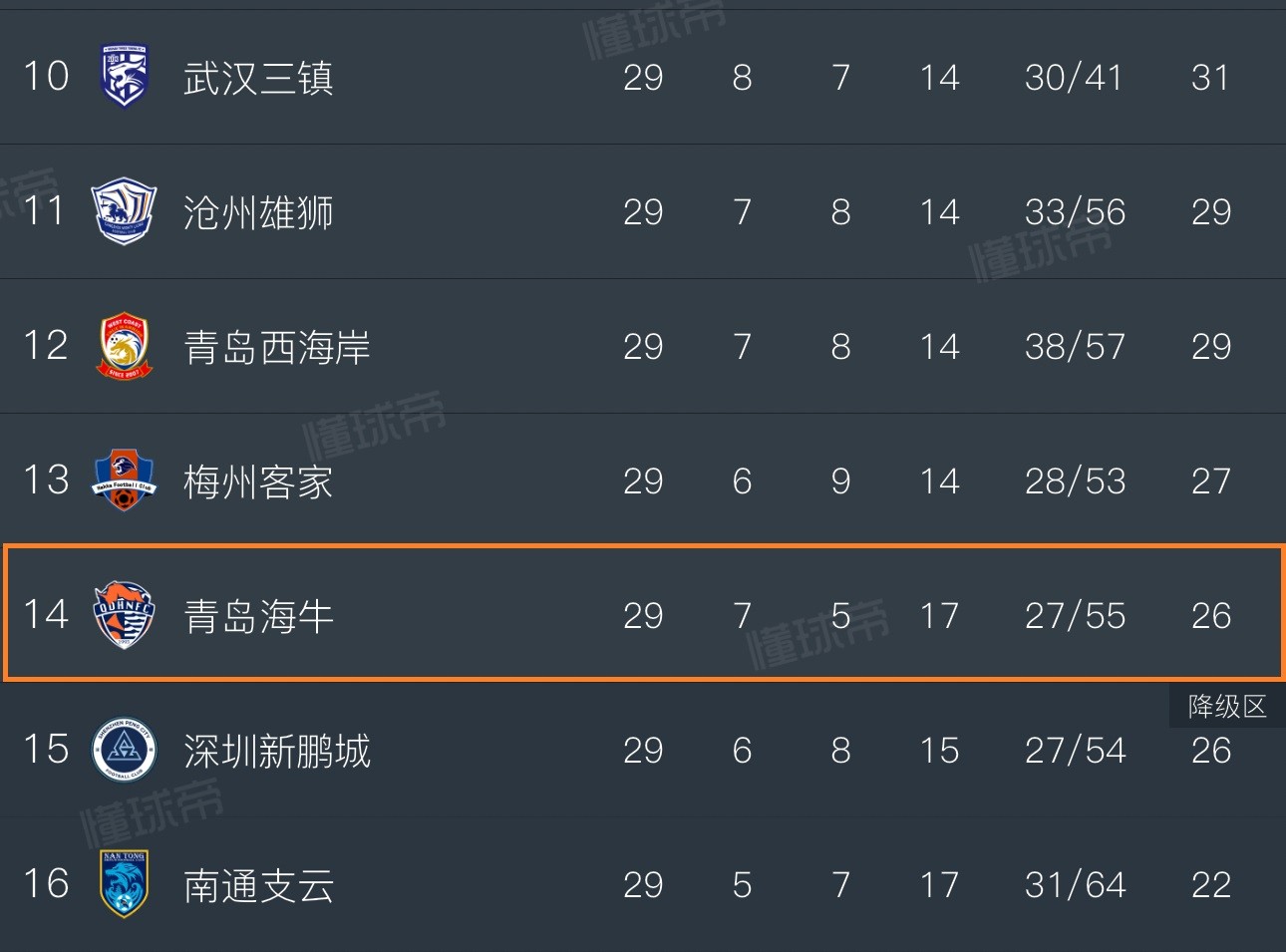中超29轮过后,目前青岛海牛队7胜5平17负、积26分,排在联赛积分榜第14位。最近5轮联赛,青岛海牛队未尝胜迹,战绩为1平4负。