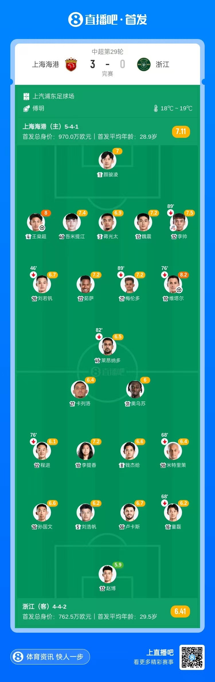 10月31日讯 北京时间10月31日18点,中超第29轮,上海海港在主场上海浦东足球场迎战浙江。上半场,刘若钒传中造成刘浩帆乌龙,随后刘若钒又射中立柱。下半场,王燊超扩大比分,维塔尔任意球破门锁定胜局,卢卡斯进球被吹。最终上海海港3-0浙江。