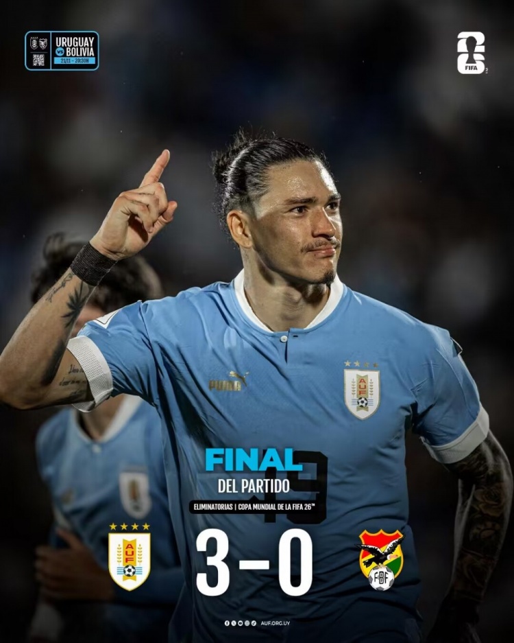 11月21日讯 北京时间11月21日早上9:30,世预赛南美区第6轮,乌拉圭主场迎战玻利维亚。上半场,努涅斯首开记录,维斯卡拉出击失误致乌龙。下半场,努涅斯梅开二度。全场结束,乌拉圭3-0玻利维亚。本场过后,乌拉圭积13分暂时跃升至第一位,玻利维亚积3分排名倒数第二。