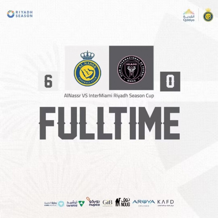 第73分钟,胜利队员中场长传,塔利斯卡单刀抽射破门,通过VAR,裁判吹罚进球有效,利雅得胜利6-0迈阿密国际!↓