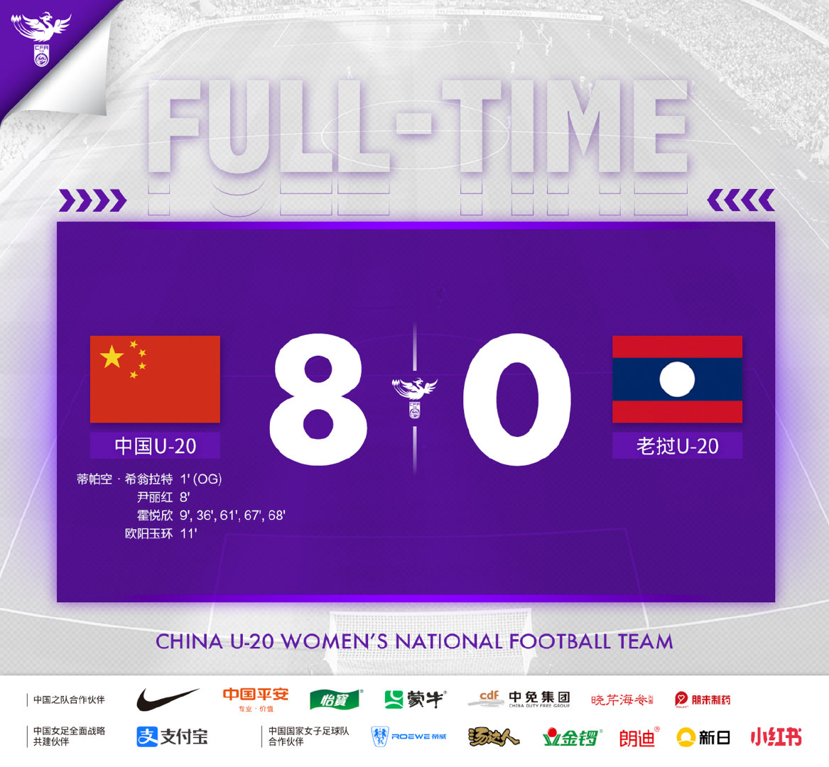 U20女足亚预赛-霍悦欣五子登科 中国8-0老挝迎三连胜