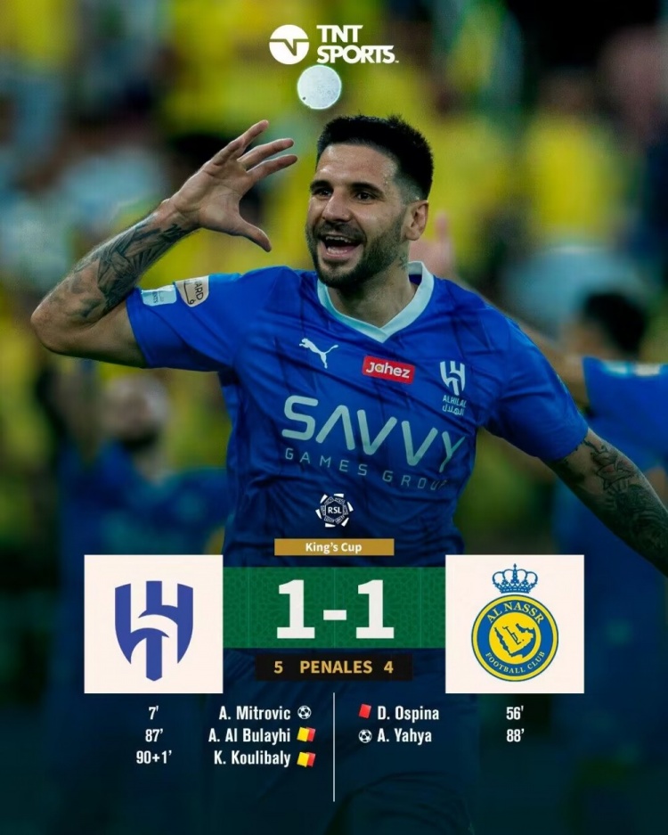 加时赛双方均无建树,将进行点球决胜!布努两扑点!最终,利雅得新月点球大战5-4,总比分6-5击败利雅得胜利!夺得沙王冠冠军,本赛季实现国内三冠王!
