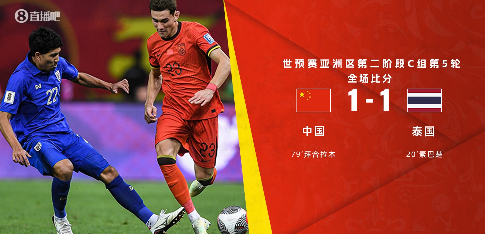 6月6日讯 北京时间6月6日晚20时整,世预赛亚洲区第二阶段C组第5轮在沈阳奥体中心展开角逐,中国男足坐镇主场迎战泰国。上半场国足后防漏人遭1米69素巴楚头球破门,阿兰中柱,泰国先后中框+中柱,下半场费南多失点&空门不射,拜合拉木首秀救主。最终中国男足主场1-1战平泰国,积分榜方面,国足积8分位居第2,泰国积5分名列第3,国足末轮客战韩国不败即可晋级18强,泰国将对阵垫底的新加坡。