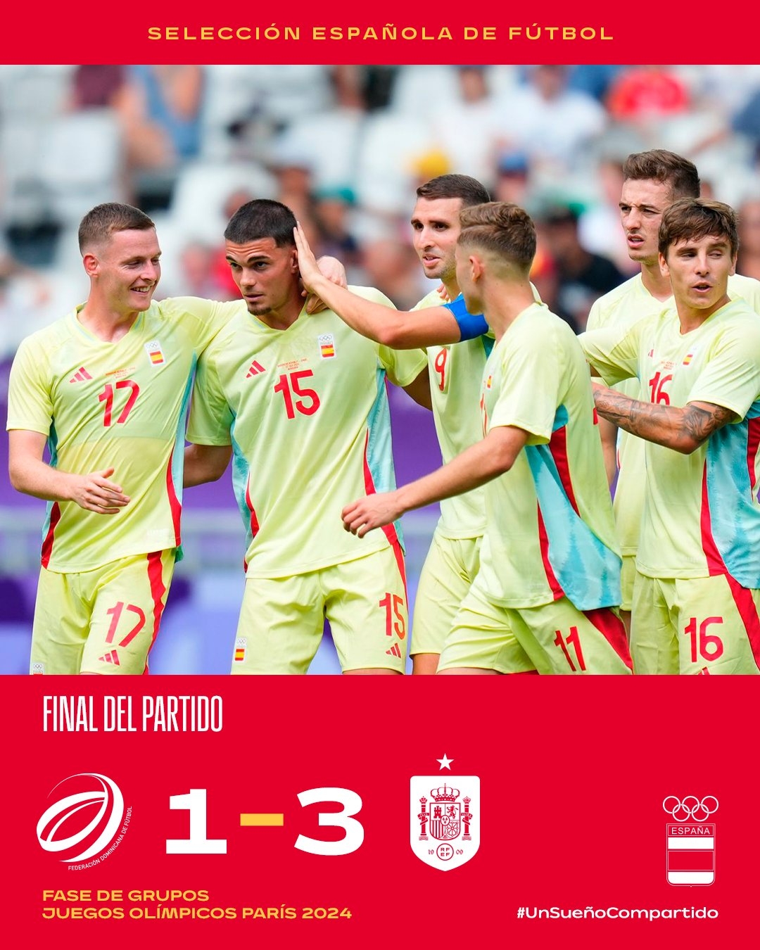 7月27日讯 北京时间7月27日21:00,奥运男足小组赛C组第二轮西班牙国奥挑战多米尼加国奥的比赛,上半场多米尼加门将博斯尔接连出球失误,费尔明推射破门,安赫尔-蒙特斯-德-奥卡头球扳平比分,爱迪生-阿兹科纳报复性动作被直红罚下,半场结束,十人多米尼加国奥1-1西班牙国奥。下半场巴埃纳远射破门反超比分,古铁雷斯替补建功,最终西班牙国奥3-1十人多米尼加国奥提前晋级八强。