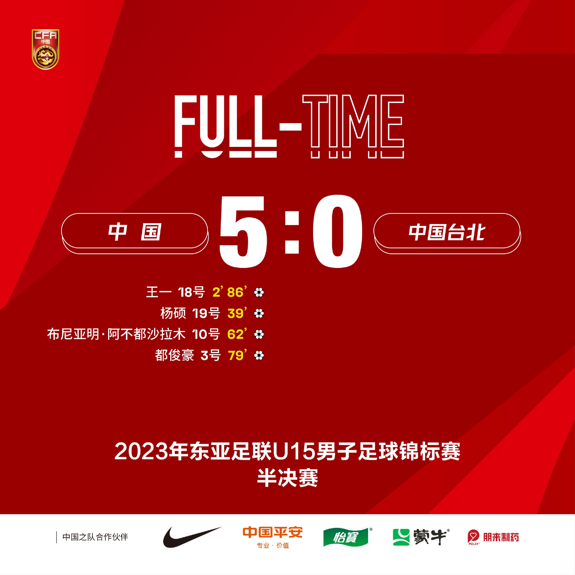 最终全场比赛结束,中国U15 5-0胜出,另一场半决赛日本4-0击败韩国,中国队与日本队会师U15亚洲杯决赛。