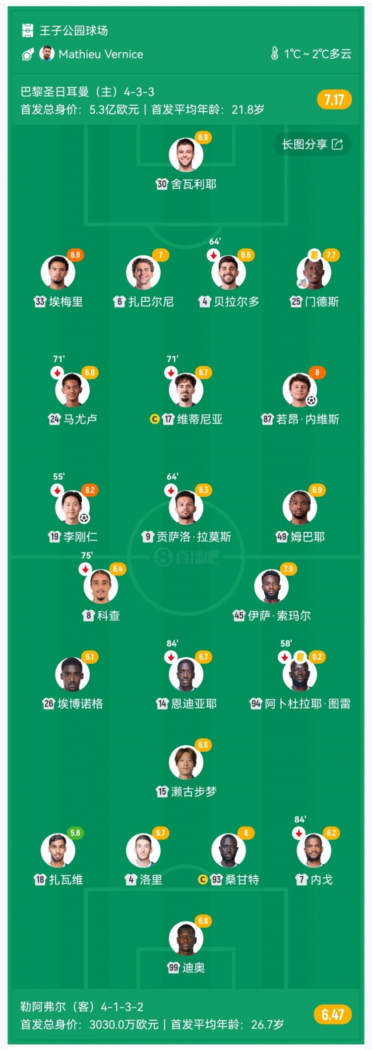 第29分钟,巴黎左路进攻,门德斯虚晃一下左脚直接传中,后点李刚仁无人盯防直接抽射入网,巴黎1-0领先↓