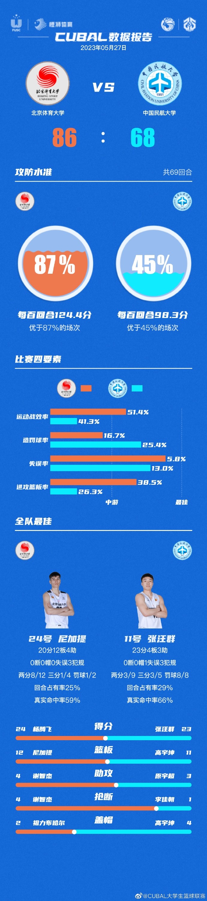 末节决战,尼加提上来又中三分,北体大抓反击,谢智杰妙传杨腾飞送出漂亮隔扣将分差再次拉开20分以上,随后中国民航进攻端略显急躁,接连单打误攻效果不佳,又是张汪群站出来接连外线发炮追分,谢智杰5犯被罚下,但张汪群也是连吃2T被直接罚出场,最终北体大86-68大胜中国民航,先下一城。