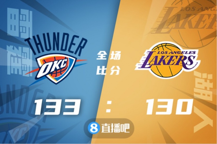 比赛上来,两队就展开了对攻大战,场上比分交替领先,次节双方的攻势依旧不减,但明显雷霆占据了上风,单节狂轰40分将分差拉开到了两位数,詹姆斯上半场展示出了不俗的进攻欲望独得20分,半场结束时湖人落后10分;下半场湖人开始发起追分,詹姆斯也终于在第三节结束前用一记后仰跳投完成登顶,末节湖人一度将比分追至106-106平,但此后他们突然断电,雷霆迅速用一波12-0的攻势再次拉开分差,之后的比赛湖人没有再获得任何机会,最终湖人130-133不敌雷霆遭遇连败。