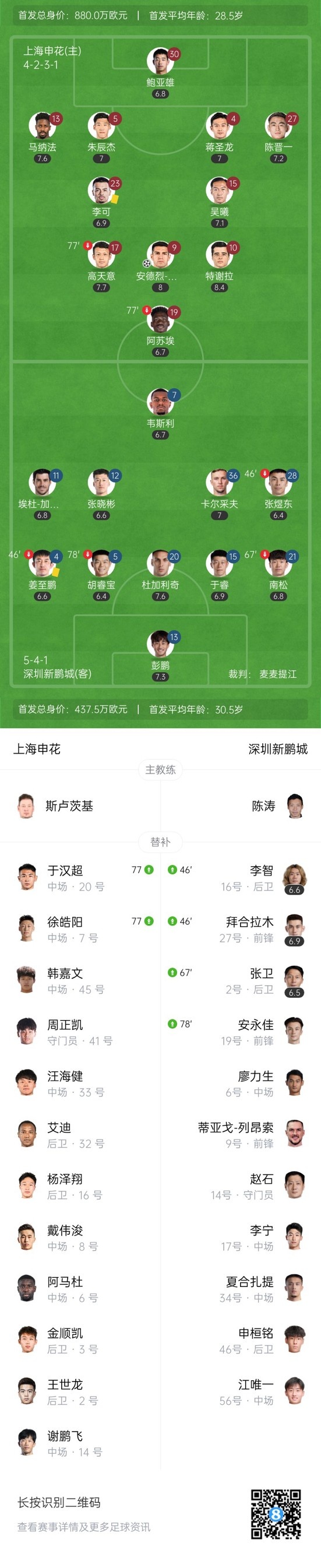 下半场补时4分钟,申花1-0深圳新鹏城。
