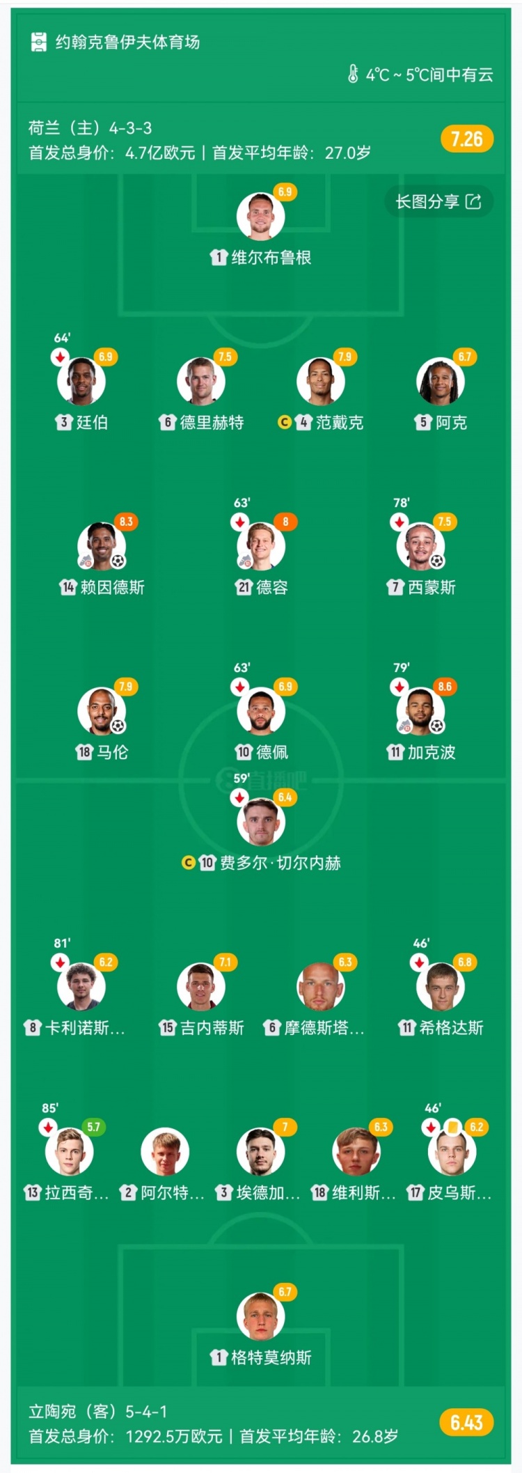 第58分钟,德里赫特禁区内头球造成对方手球,VAR介入主裁亲自回看后判罚点球,加克波主罚稳稳命中,荷兰2-0领先↓