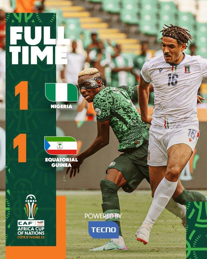 1月14日讯北京时间1月14日22时,非洲杯小组赛A组,尼日利亚对阵赤道几内亚。上半场,萨尔瓦多破门为赤道几内亚取得领先,随后卢克曼助攻奥斯梅恩破门扳平比分!半场战罢,尼日利亚暂1-1赤道几内亚;下半场,奥斯梅恩单刀射偏错失反超机会,尼日利亚苦攻无果,全场比赛结束,尼日利亚1-1赤道几内亚!