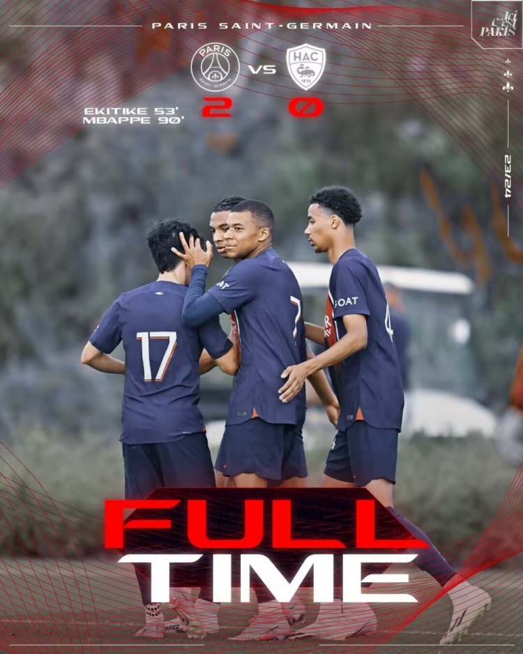 全场比赛结束,巴黎2-0勒阿弗尔。